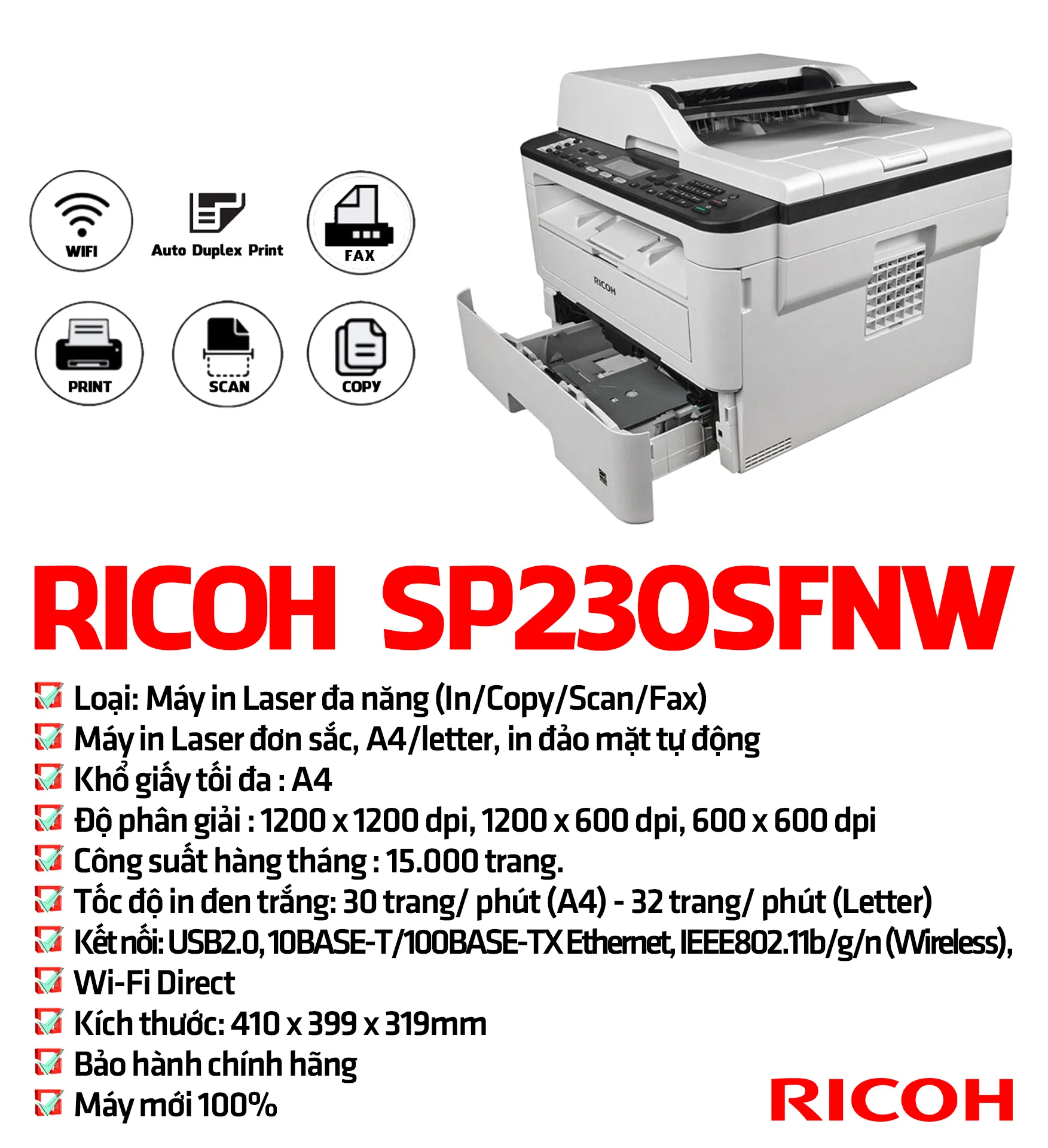- Chức năng chuẩn: In – Copy – Scan – Fax – Duplex – LAN – WiFi